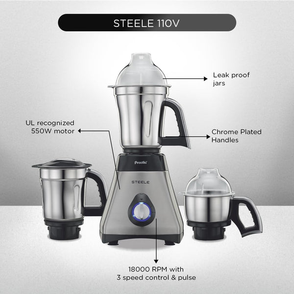 Preethi Steele 110V Mixer Grinder for Kitchen | 3 Jar, 550W Mixie| Perfect for Grinding | Silver/Black (MG 206)