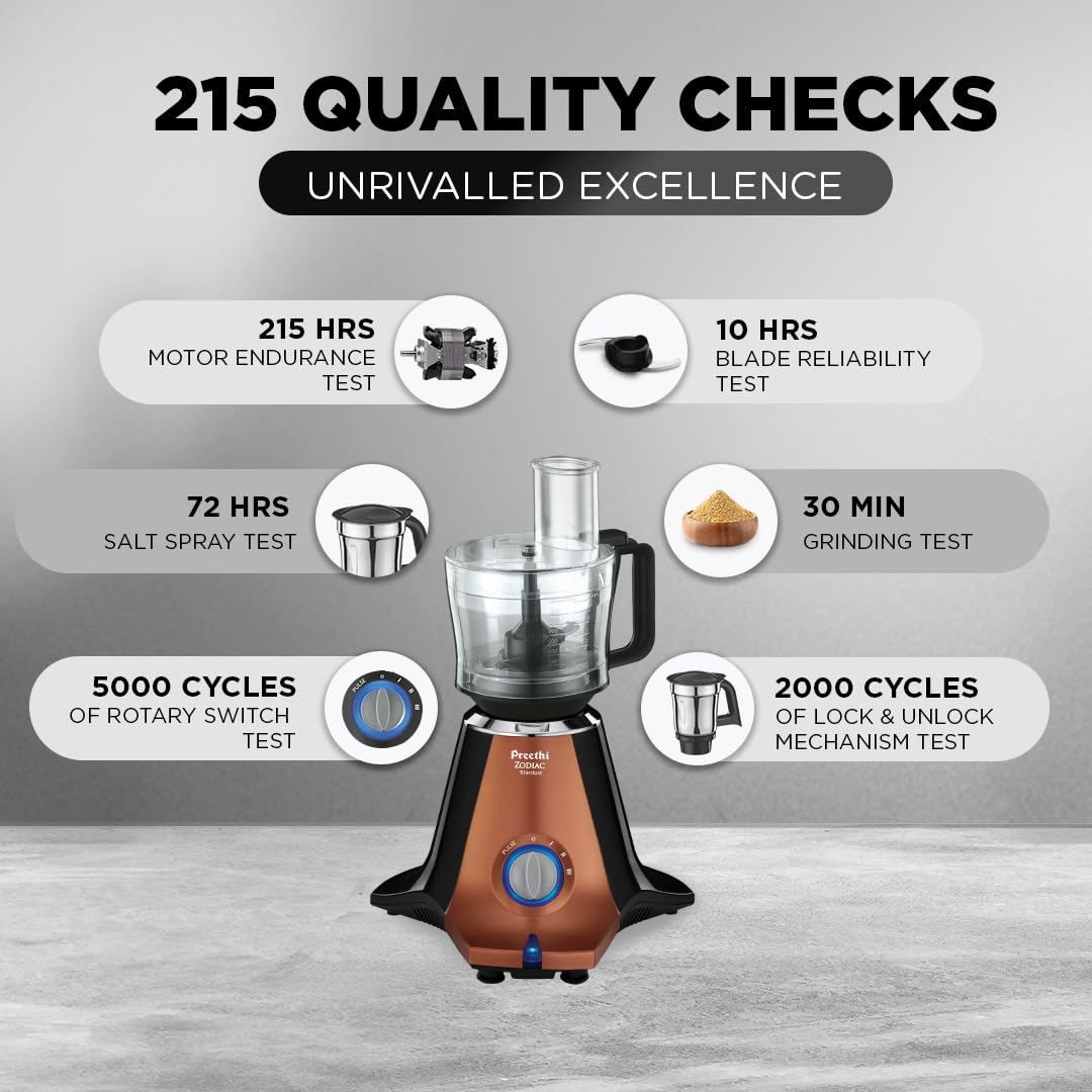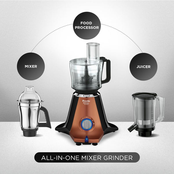 Preethi Zodiac Stardust Mixer Grinder for Kitchen, 5 Jars 750 Watt Mixie (3 Stainless steel Jars +1 Juicer Jar+1 Master Chef Plus Food processor Jar), Black/Copper (MG-265)