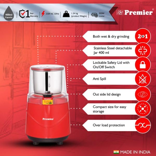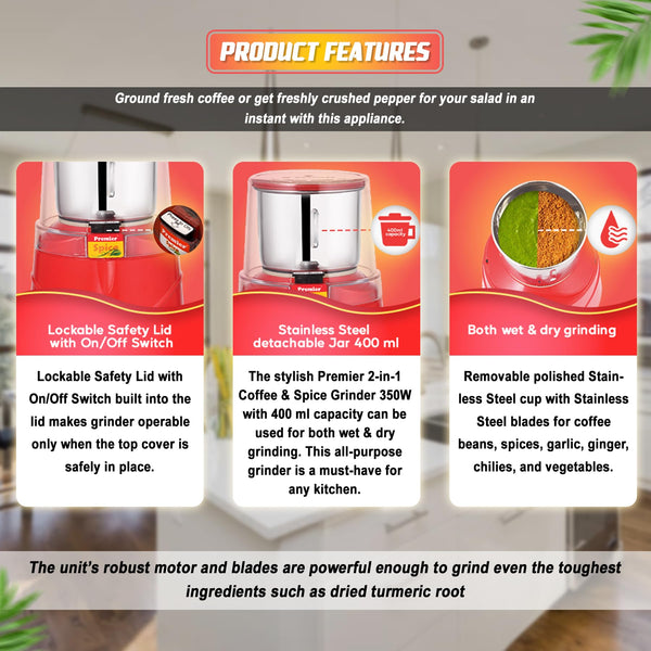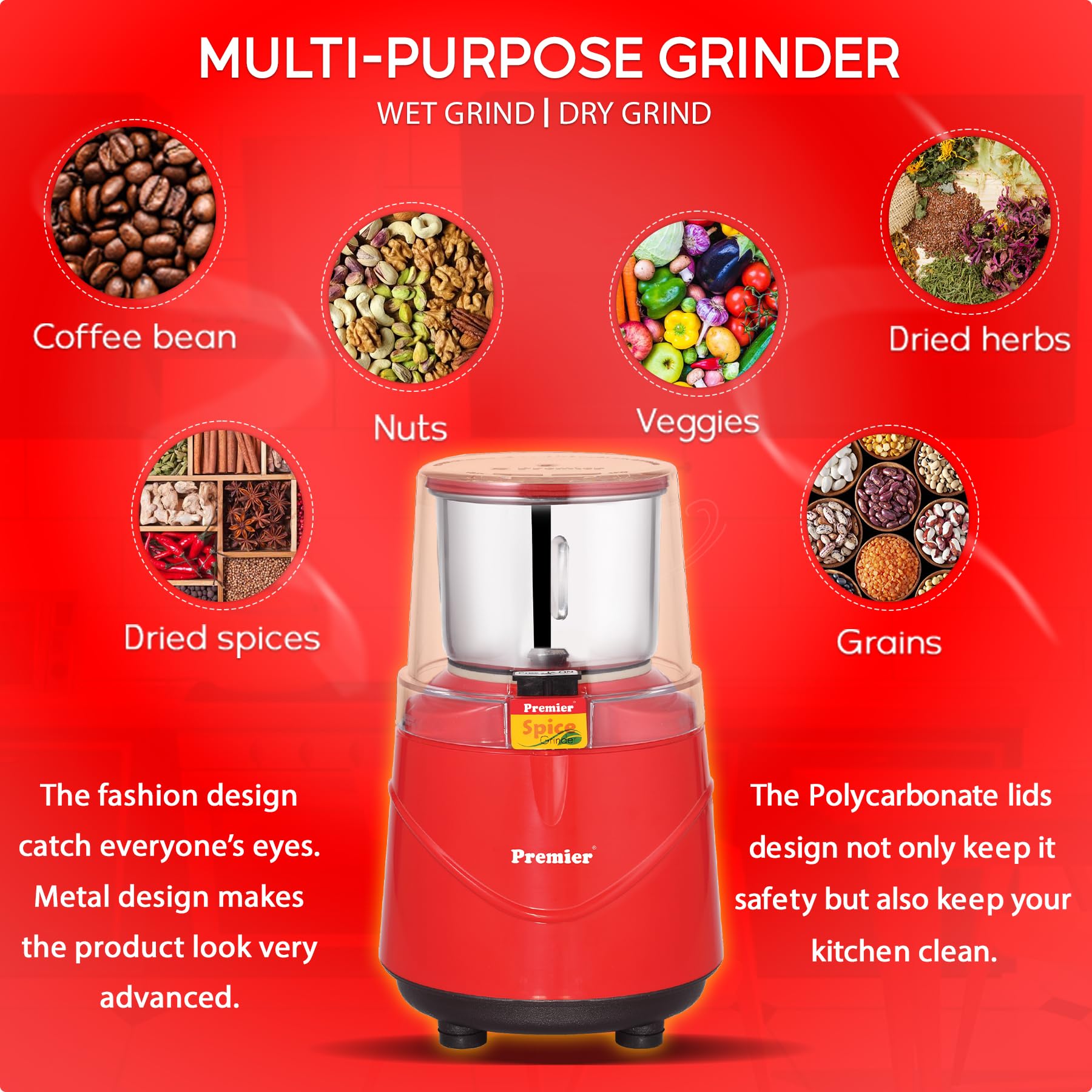 Premier Spice Grinder KM-521 | 350W Wet & Dry Multifunction Food Grinder |Stainless Steel Herbs, Spices, Nuts, and Grain Grinder for Home & Office with Detachable Jar