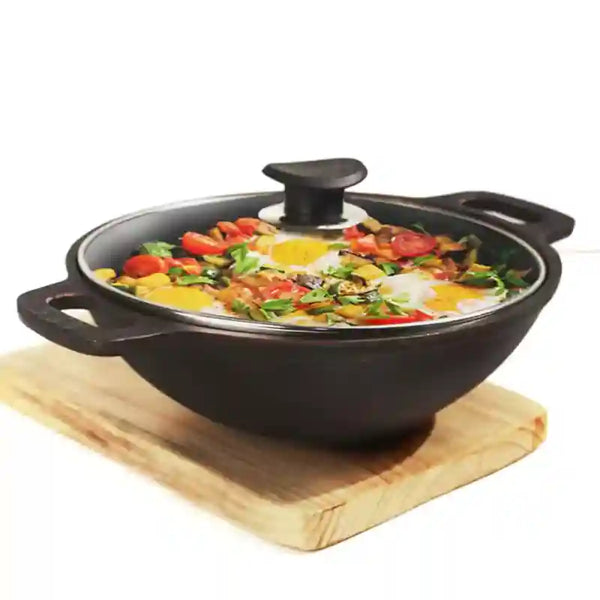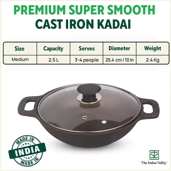 Super Smooth Cast Iron Kadai (Wok)+ Glass Lid, Pre-seasoned, Nonstick, 100% Pure,Toxin-free, 25.4cm, 2.5L, 2.4kg