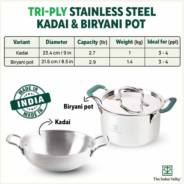 TurboCuk Tri-ply Stainless Steel Cokware Set: Kadai+ Biryani Pot, Premium Quality, 3 Layer Thick Body, 100% Toxin-free, Non-stick, Induction & Gas, Free ₹600 Wooden Board