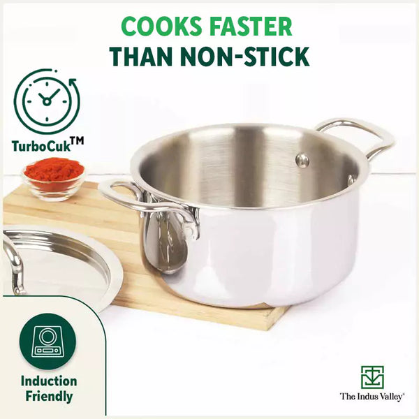 TurboCuk Tri-ply Stainless Steel Casserole/ Cooking Pot/ Sauce Pot+ Steel Lid, Premium Quality, 3 Layer Thick Body, 100% Toxin-free, Non-stick, Induction & Gas, 2.1L