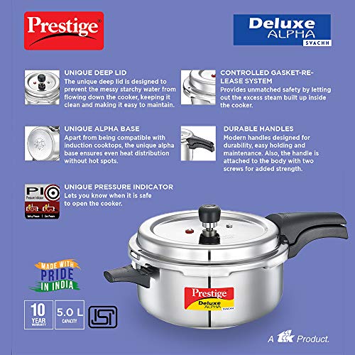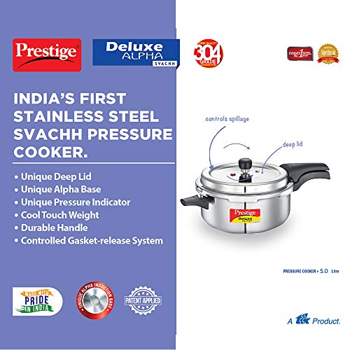 Prestige 5L Deluxe Alpha Svachh stainless steel Pressure Cooker|Outer lid|Ideal for 5-7 persons|Deep lid for spillage control|Gas & induction compatible|Silver