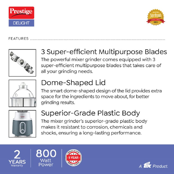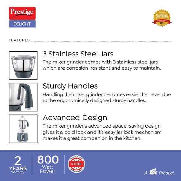 Prestige Delight Mixer Grinder 750 W (With 3 Stainless Steel Jars)