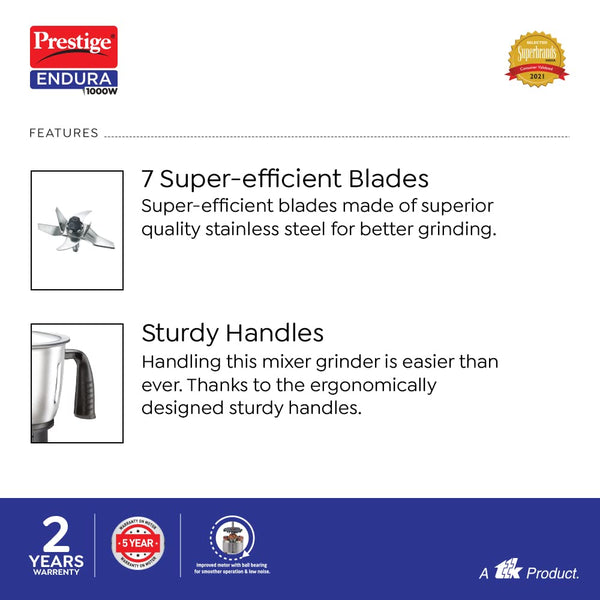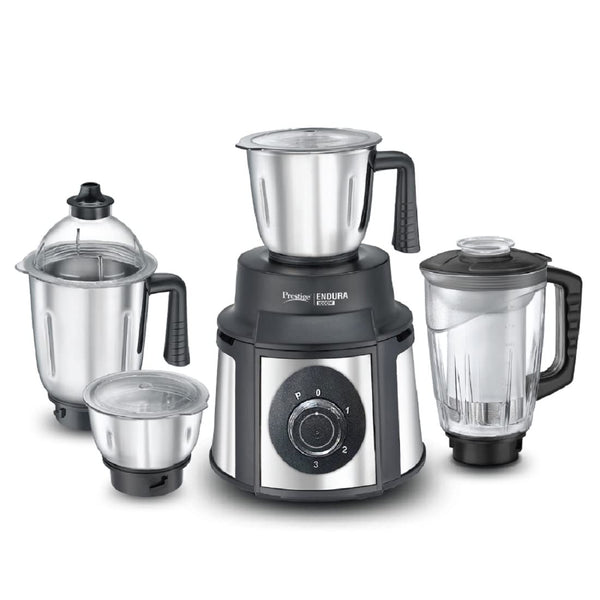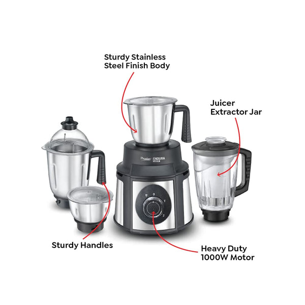 Prestige Endura 1000W Mixer Grinder with Ball Bearing Technology(Stainless Steel 4 Jars, Black & Silver)