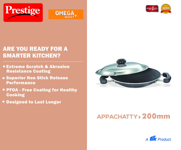 Prestige Omega Select Plus Non-Stick Deep Appachetty with Lid | Black | 20 cm | Residue Free | Scratch Resistant | Comfortable Grip | Spoon Friendly