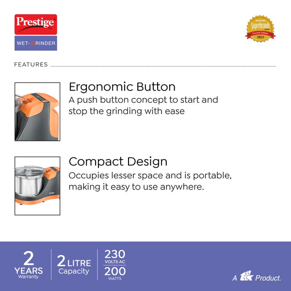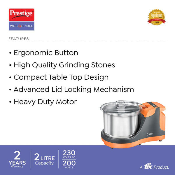 Prestige PWG 10 Wet Grinder with 200 Watts Motor, Multi Color
