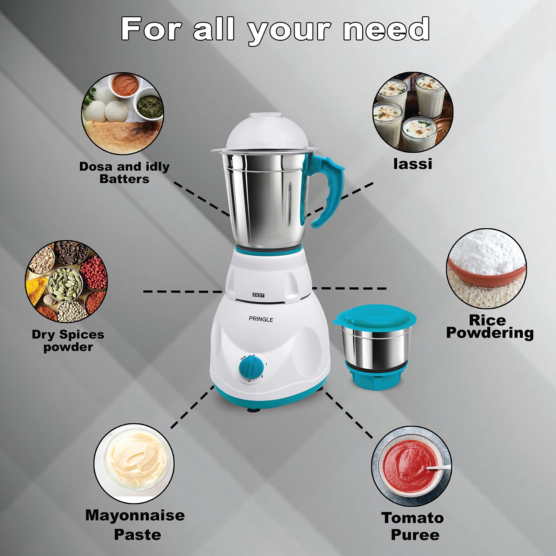 Pringle 550Watt Mixer Grinder with 2 Leak Proof Stainless Steel Jars| 30 Min Motor Rating| Robust Nylon Coupler | Overload Protection| ISI Certified| 2 Year Warranty