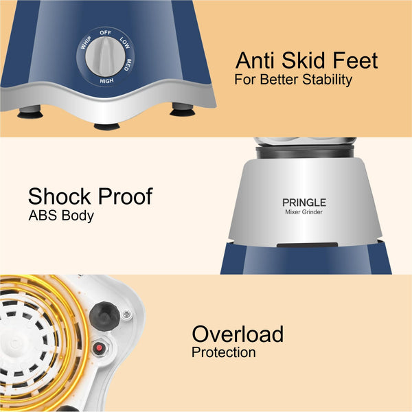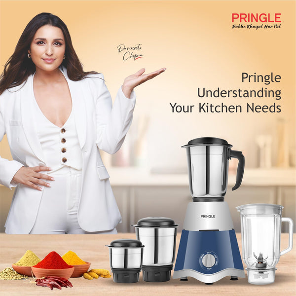 Pringle Crown Dlx 750 Watt Juicer Mixer Grinder with 4 Jars for Grinding, Mixing, Juicing with Powerful Motor | 1 Year Warranty | (Blue & Gray, 4 Jars)