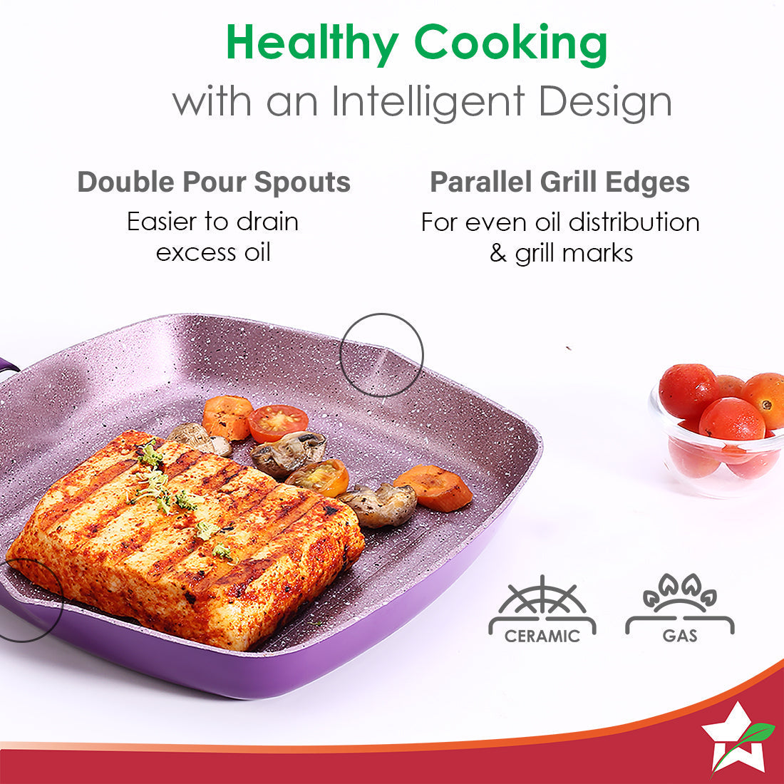 Royal Velvet 20cm Grill Pan | Soft-touch handles |Non – Toxic I Virgin Aluminium| 3 mm thick | 2 year warranty | Purple