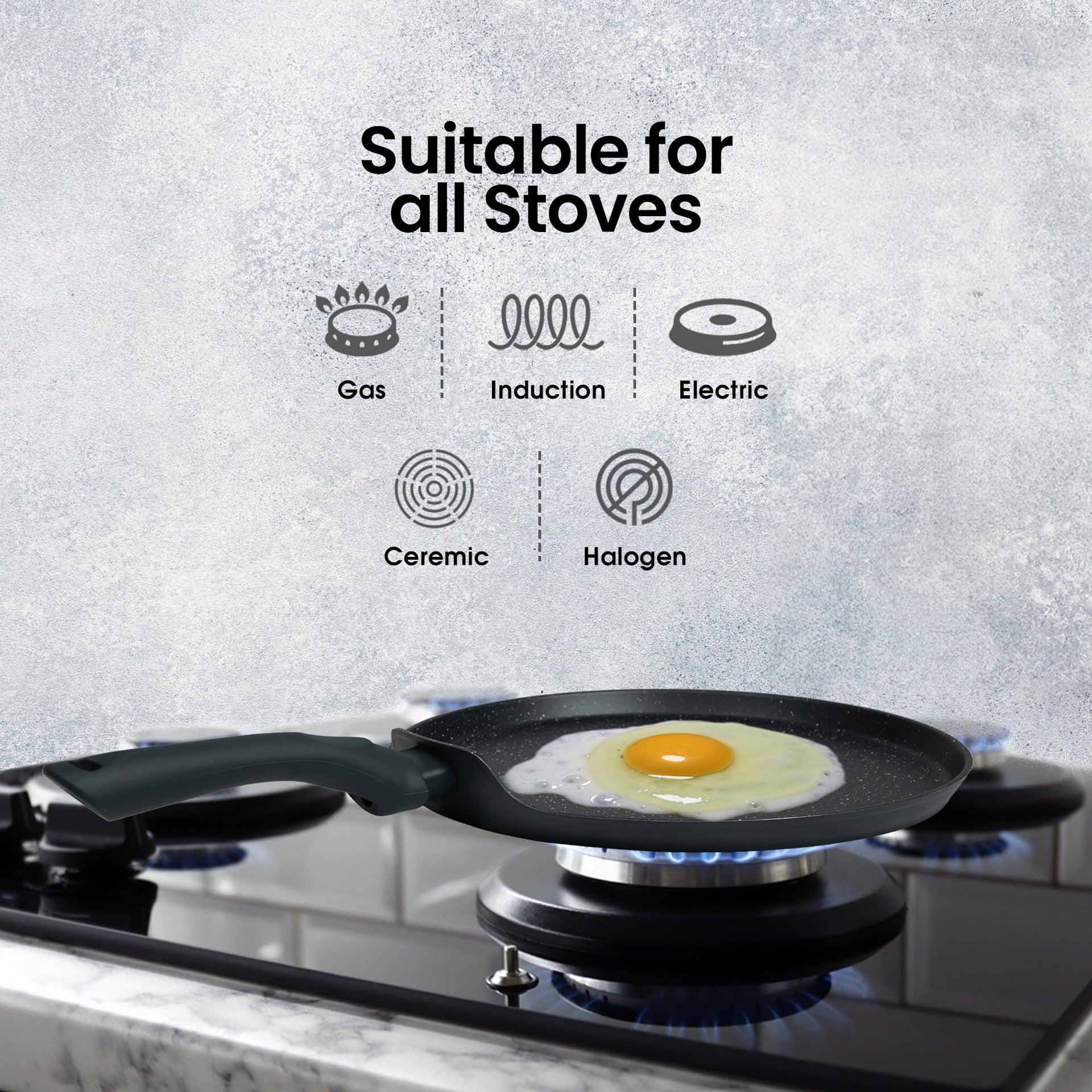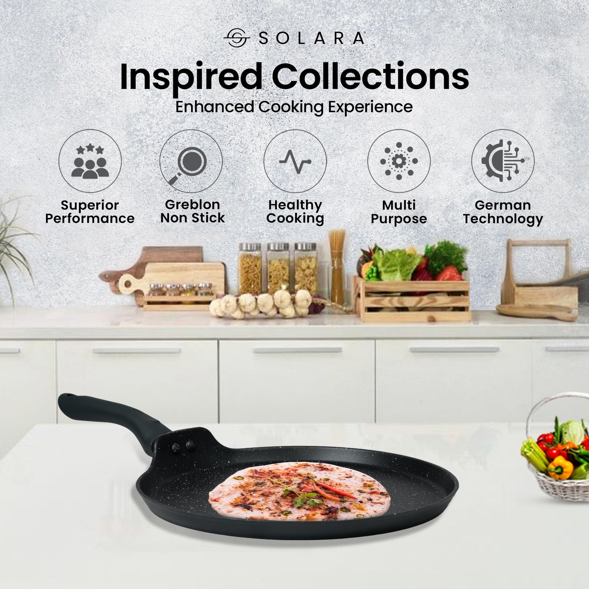 SOLARA Granite Dosa Tawa Non Stick Pan 28cm, Dosa Tawa Induction Base & Gas Compatible with Soft-Touch Handles, Flat Dosa Tava - Black