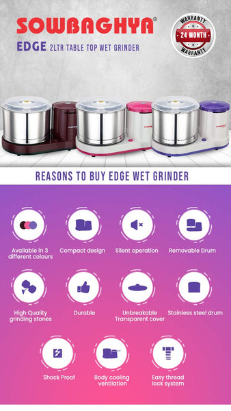 SOWBAGHYA Edge Wet Grinder 2 Litre -Blue Voilet Tabletop Design, Stainless Steel Drum, Compact & Silent - Powerful Motor, Idli Dosa Batter Machine for Home, 2 Yr Warranty, 1440 RPM