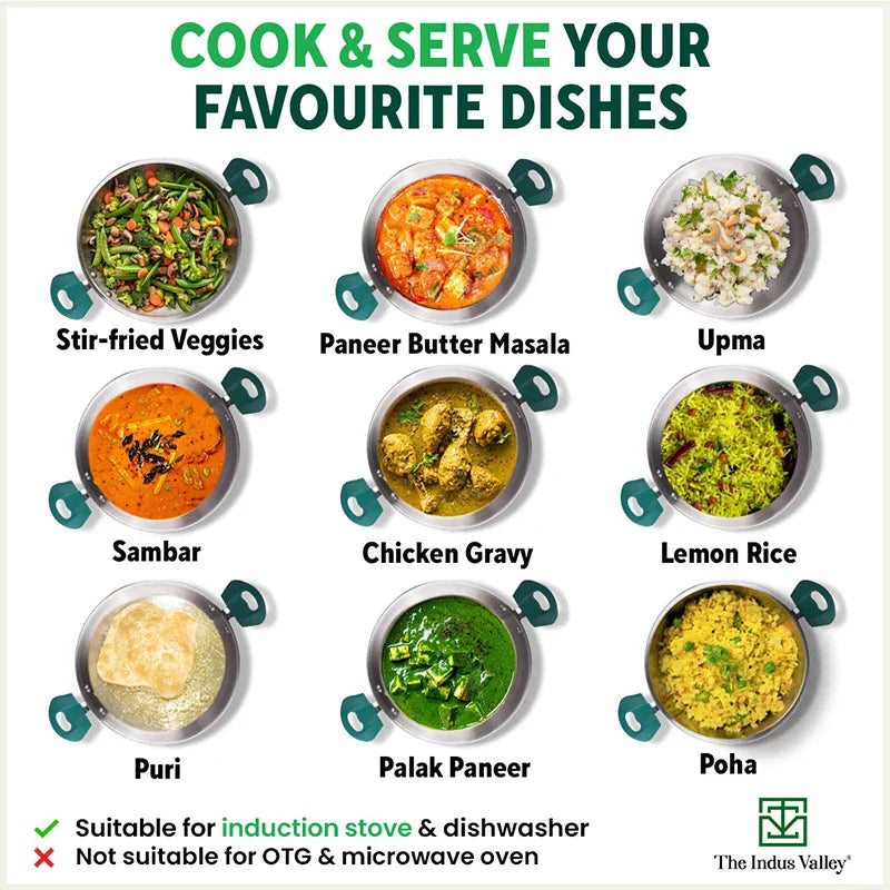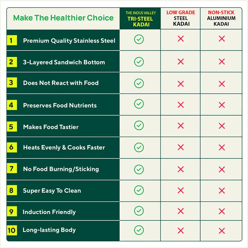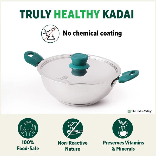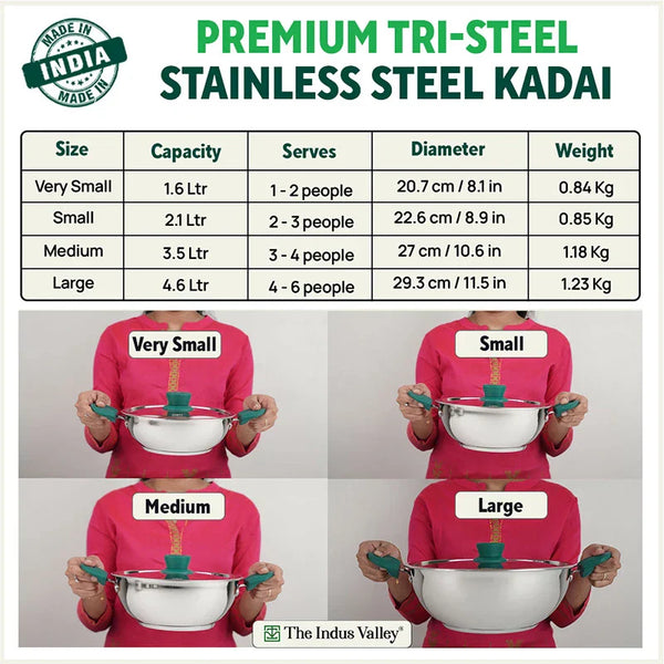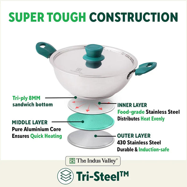 Tri-Steel Stainless Steel Kadai+ Lid, Premium Quality, Tri-ply (3 Layer) Bottom, Soft-touch Handles, 100% Toxin-free, Non-stick, Induction & Gas, 1.6/2.7/3.5/4.6 L, 20.7/22.6/26/29.3 cm