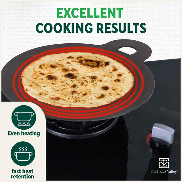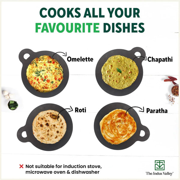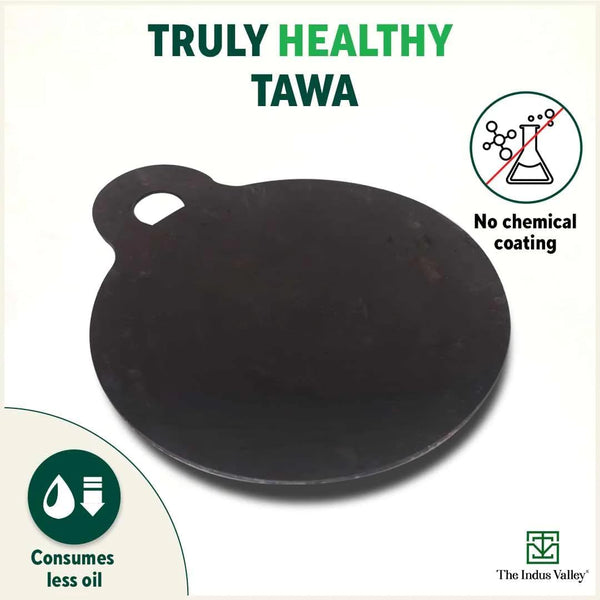The Indus Valley Pre-Seasoned Iron Tawa with Wooden Spatula & Flip for Dosa/Chapathi | 28cm/11 inch, 1.5kg | Gas Compatible | 100% Pure & Toxin-Free, No Chemical Coating