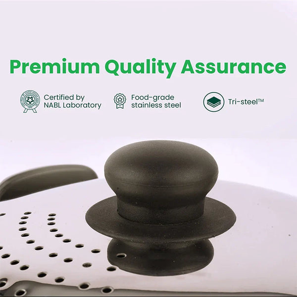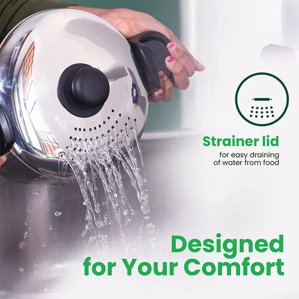 Tri-steel Stainless Steel Strainer Pot with Lockable Bakelite Handles | Sandwich bottom | Noodle Pot with Strainer Lid | Pasta Pot | Rice Strainer Pot 1.08 Kg / 19cm