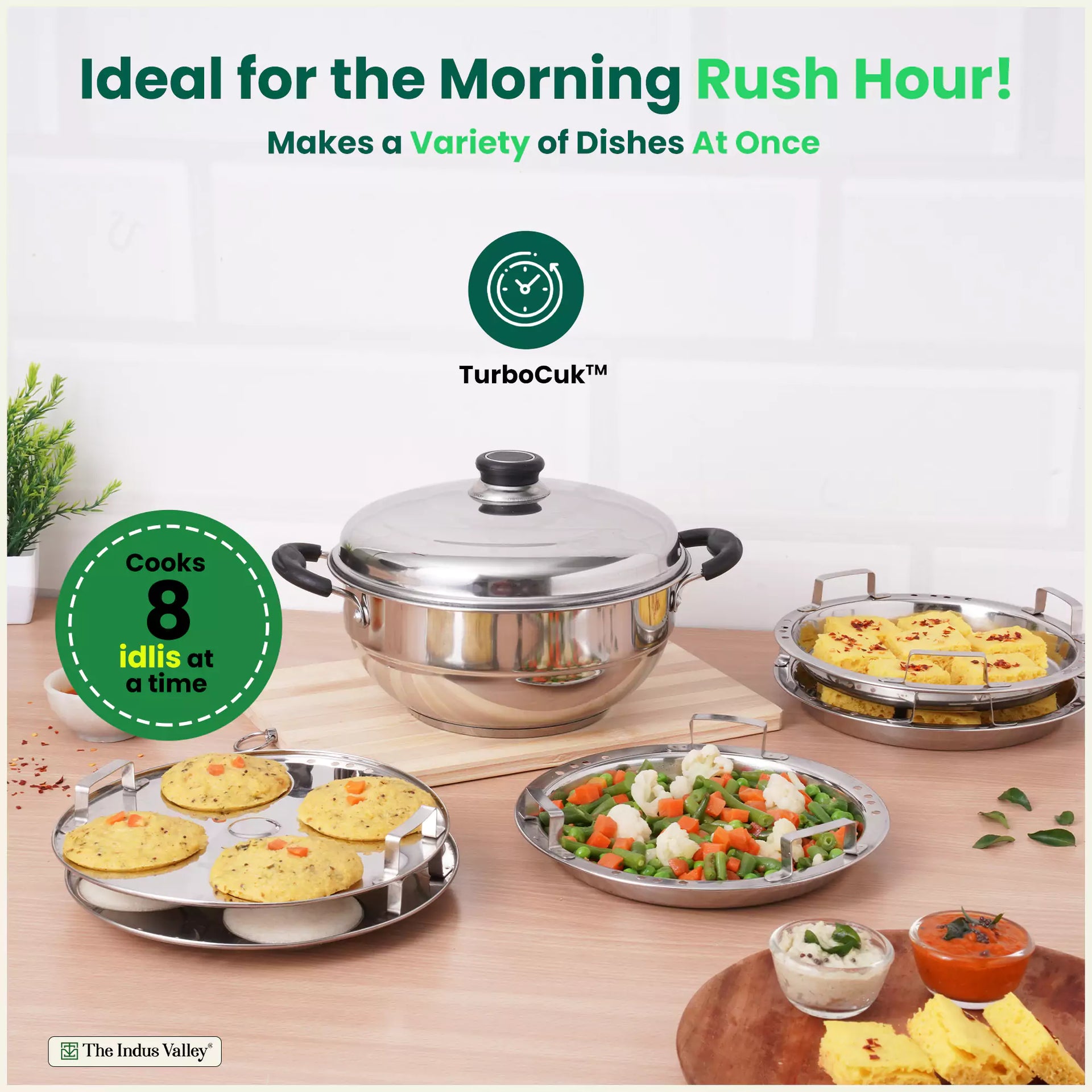 4 Pit Tri-Steel Premium Stainless Steel Idli/ Dhokla/ Momo Maker/ Multi Pot/ Veg Steaming Set, Tri-ply Induction Bottom, 5 Plates, 3L