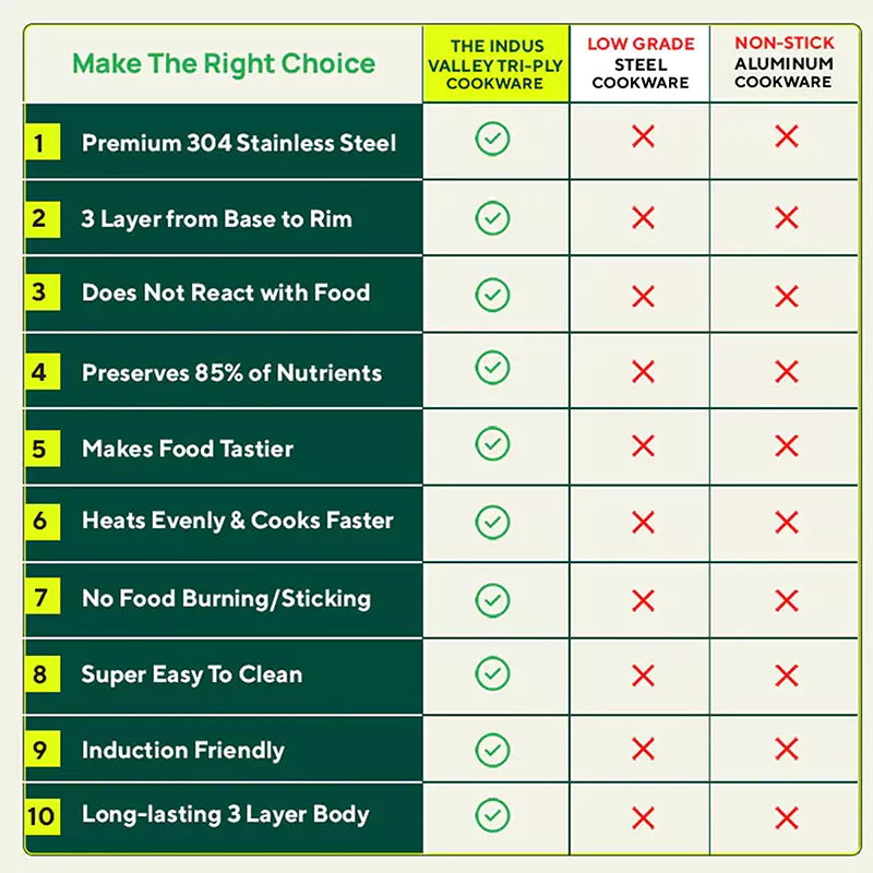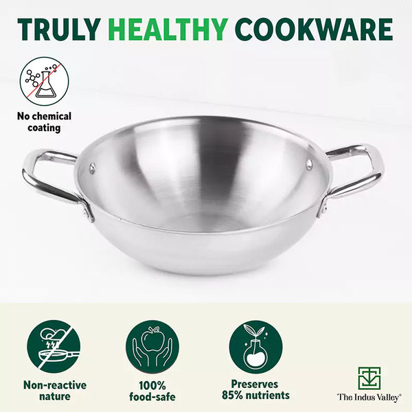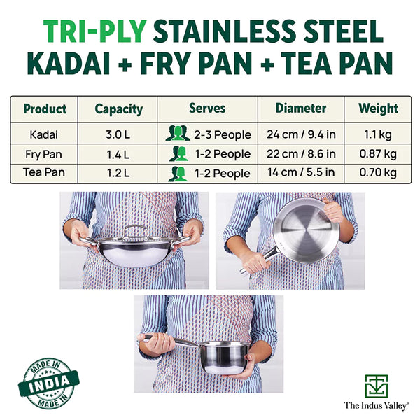 TurboCuk Tri-ply Stainless Steel Cookware Set: Kadai+ Frypan+ Tea/Milk pan, Premium Quality, 3 Layer Thick Body, 100% Toxin-free, Non-stick, Induction & Gas