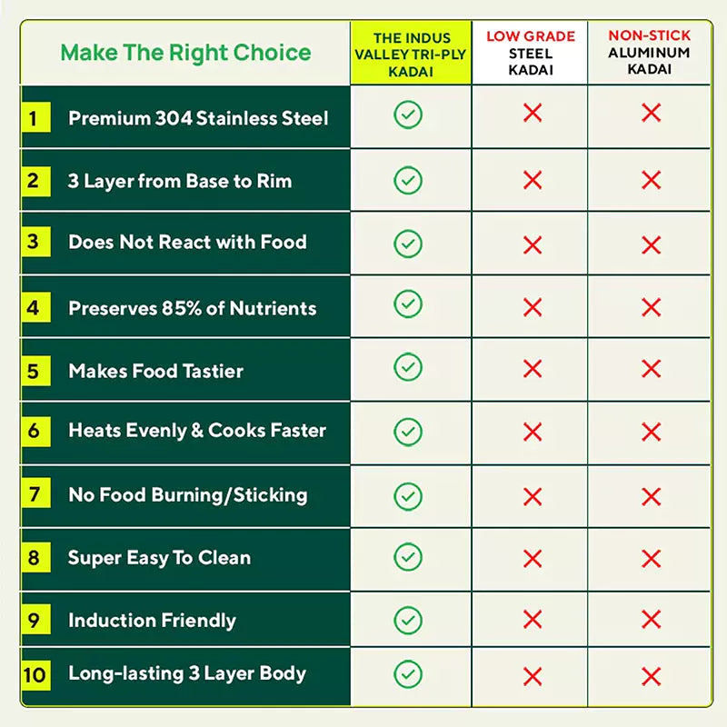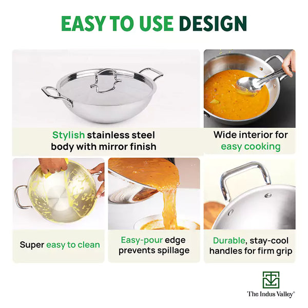 TurboCuk Tri-ply Stainless Steel Kadai+ Steel Lid, Premium Quality, 3 Layer Thick Body, 100% Toxin-free, Non-stick, Induction & Gas, 3L/3.5L/3.9L/4.5L