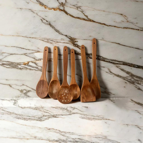 Uttam Essentials Wooden Cooking Utensil Set Non-Stick Pan Kitchen Tool Wooden Cooking Spoons and Spatulas Wooden Spoons for Cooking Salad Fork Cooking Spoon (Set of 6)