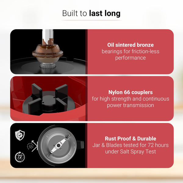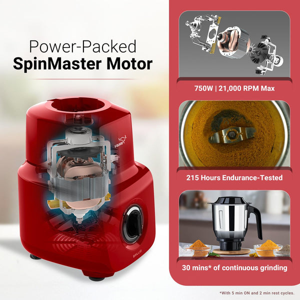 V-Guard Brillio 750 Watt Juicer Mixer Grinder, 3 Year Motor Coverage by V-Guard, 4 Jars(Chutney, Dry, Wet & Juicer), Sturdy Juicer Jar With Quadraflow Design, Precisionblend Ss Blades, Mars Red