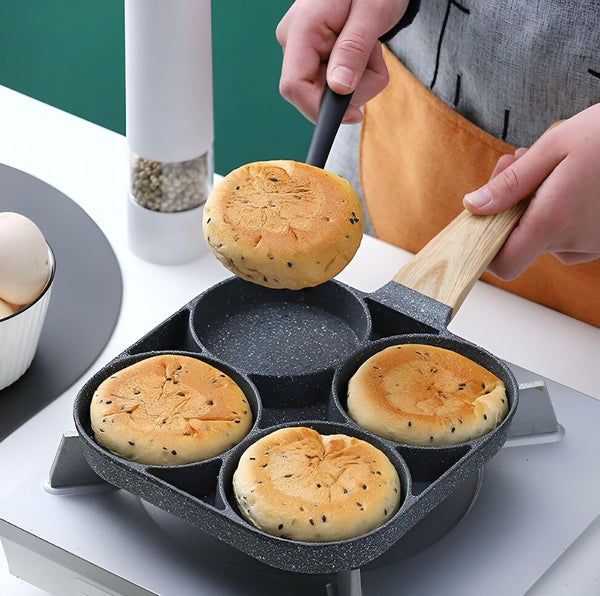 VDNSI Non Stick Frying Pan 4 Hole Ceramic Pan for Cooking Non Stick Egg Frying Pan with Wooden Handle Non Stick Omelette Pan Iron Cooking Pans for Kitchen (1pcs) (Black)