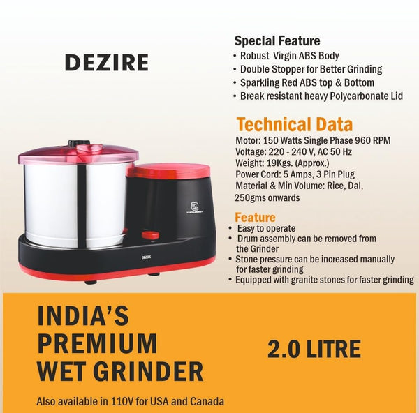 VIJAYALAKSHMI | Dezire 2 Litre | Heavy ABS Body Wet Grinder, 2L (Black & Red) | with Coconut Scrapper & Atta Kneader Attachment.