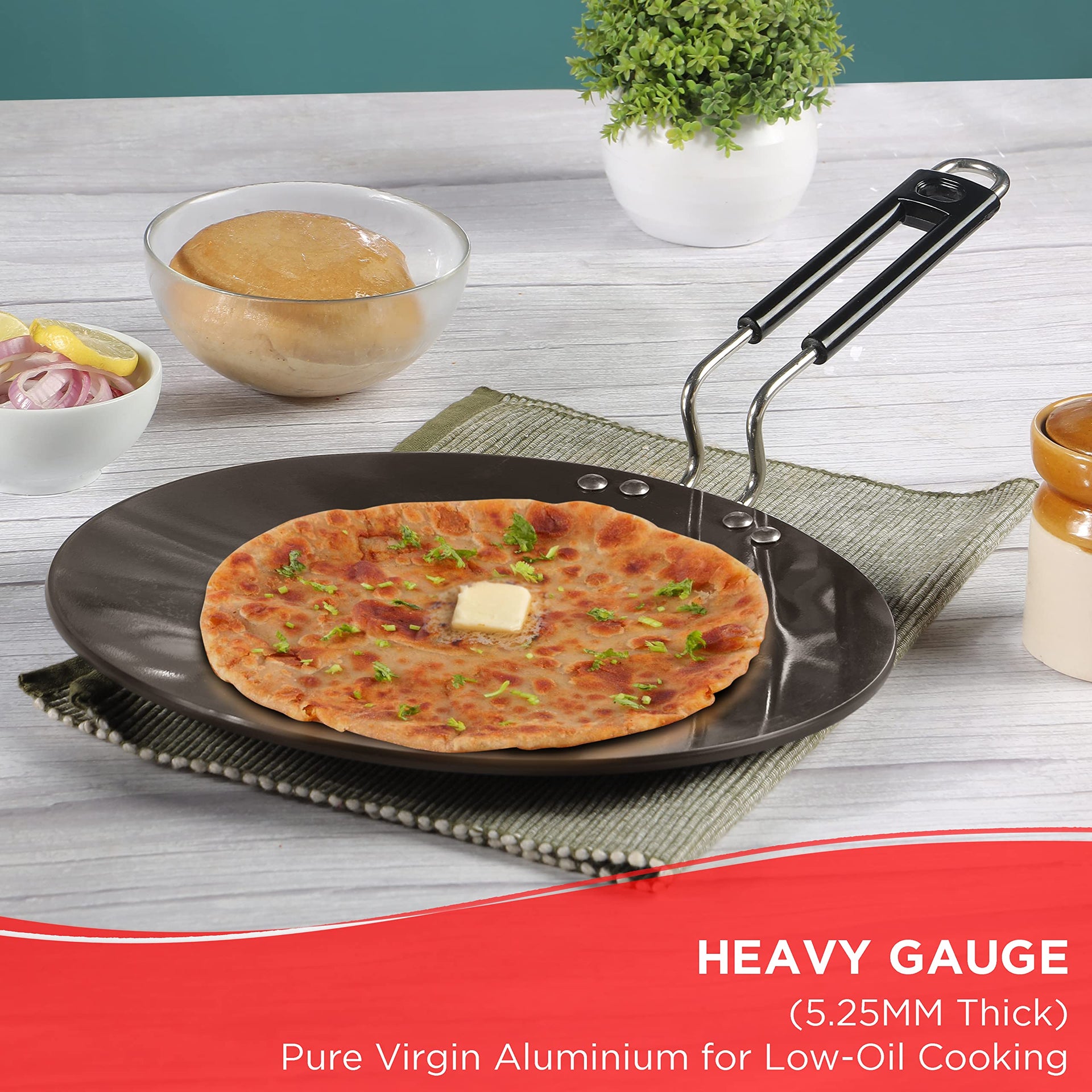 Vinod Black Pearl Hard Anodised Tawa - 28 cm | 5.25mm Thickness | Metal Spoon Friendly | Riveted Sturdy Handle | Long Lasting Roti, Paratha Tawa | 2 Year Warranty | Toxin Free