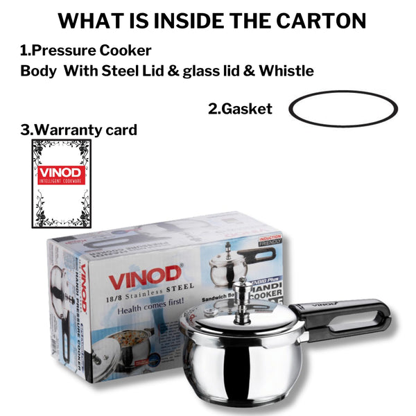 Vinod Splendid Plus Stainless Steel Pressure Cooker Outer Lid 1.5 Litre | SAS Bottom Handi Cooker | Extra Glass Lid | Induction and Gas Base | ISI and CE certified | 2 Years Warranty
