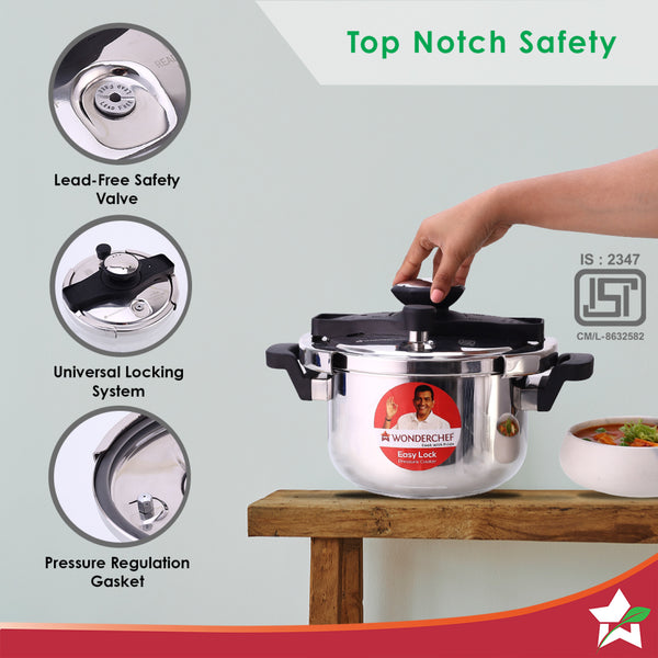 Easy Lock Stainless Steel 5L Outer Lid Pressure Cooker | Induction Compatible | Tri-Ply Bottom | 5 Year Warranty | Free Glass Lid | Silver