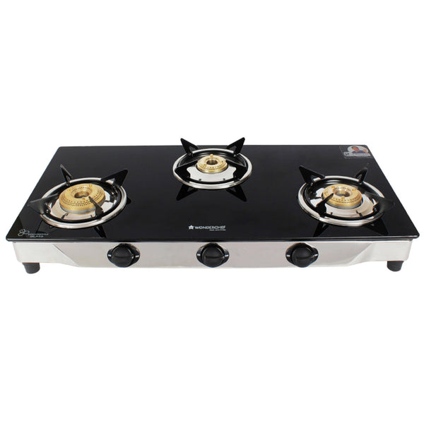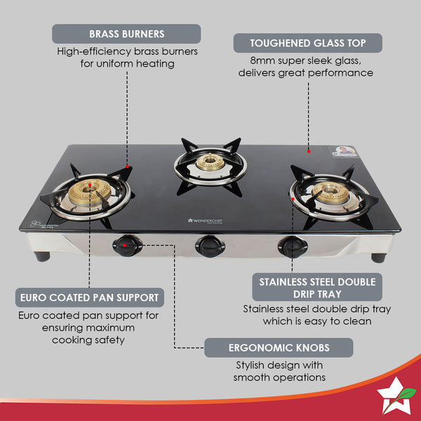 Energy 3 Burner Glass Cooktop, Black 8mm Toughened Glass with 1 Year Warranty, Soft Touch Knobs, Efficient Brass Burners, Stainless Steel Double Drip Tray