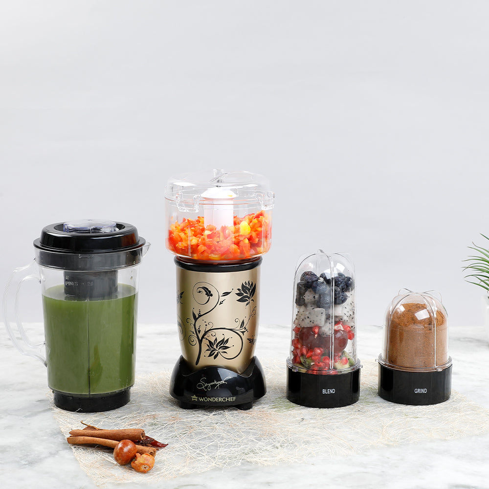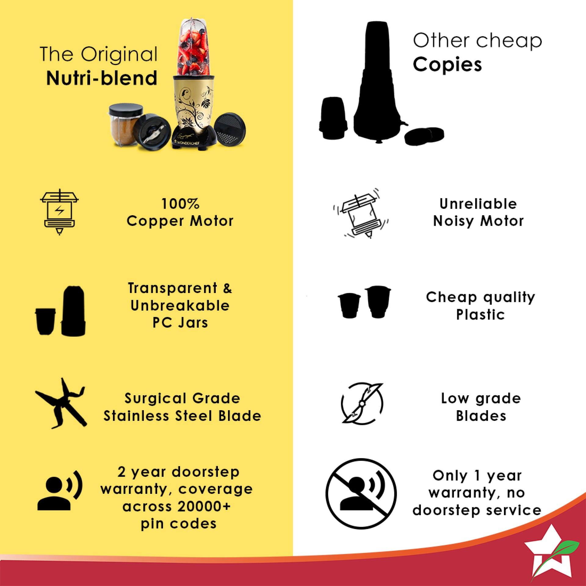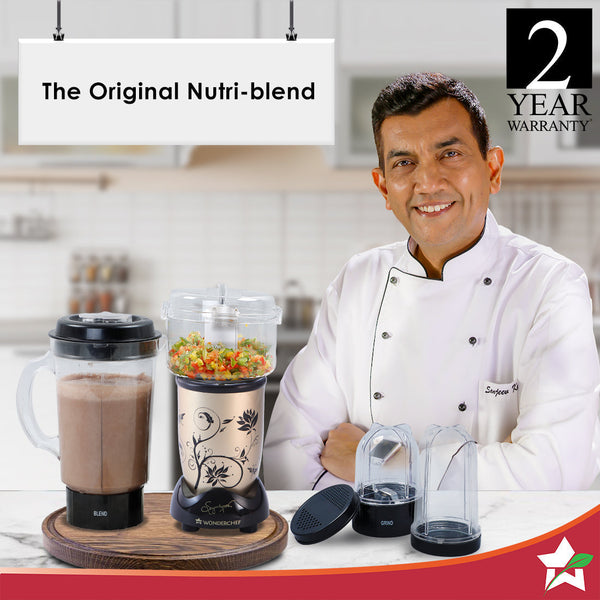 Nutri-blend Juicer, Mixer, Grinder, Smoothie Maker & Chopper | Complete Kitchen Machine | 22000 RPM Blender, Chopper, Juicer | 500W 100% Full Copper Motor | SS Blades | 4 Unbreakable Jars | 2 Years Warranty | Recipe Book By Chef Sanjeev Kapoor | Champagne