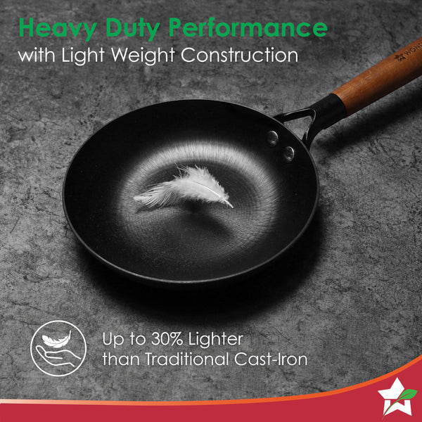 Wonderchef Pre-Seasoned Ferro Light 24cm Cast Iron Fry Pan | 1.4L | Acacia Wooden Handles | Gravity Moulding Technology | No Chemical Coating |10 Year Warranty