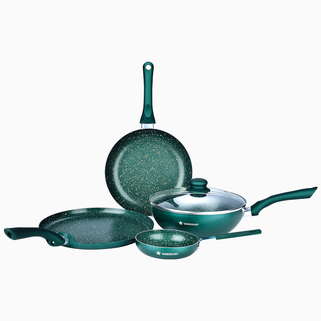 Royal Velvet Non-stick Cookware Set, 5Pc (Fry Pan with Lid, Wok, Dosa Tawa, Mini Fry Pan) Induction bottom, Soft-touch handles, Virgin Grade Aluminium, PFOA/Heavy Metals Free, 2 Years Warranty, Olive Green