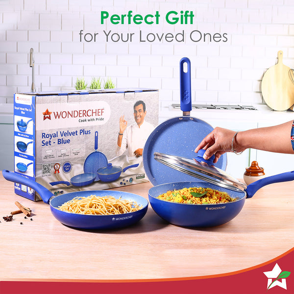 Royal Velvet Non-stick Cookware Set, 4Pc (Fry Pan with Lid, Wok, Dosa Tawa) Induction Bottom, Soft-touch Handles, Virgin Grade Aluminium, PFOA/Heavy Metals Free, 3mm, 2 Years Warranty, Blue