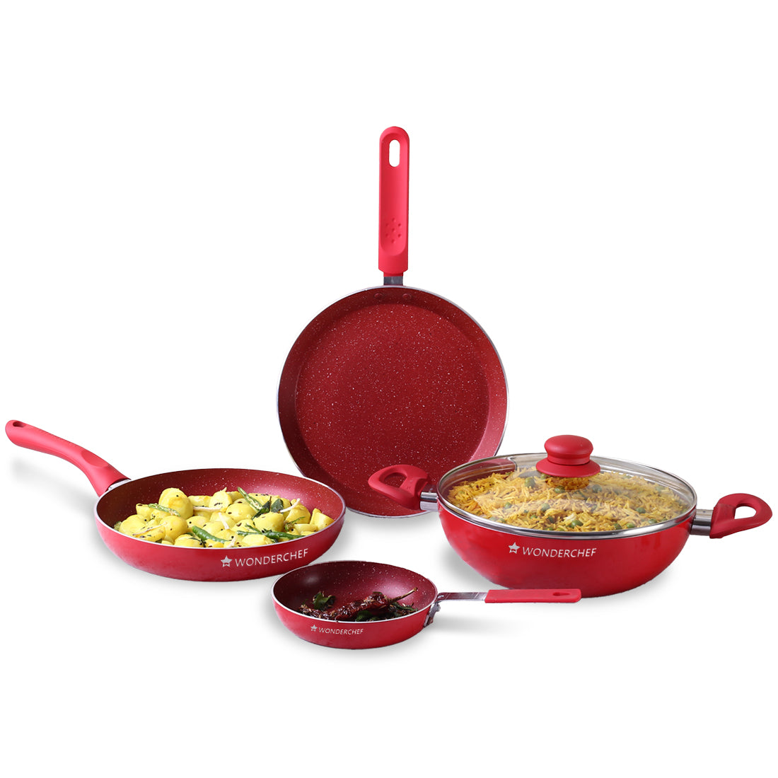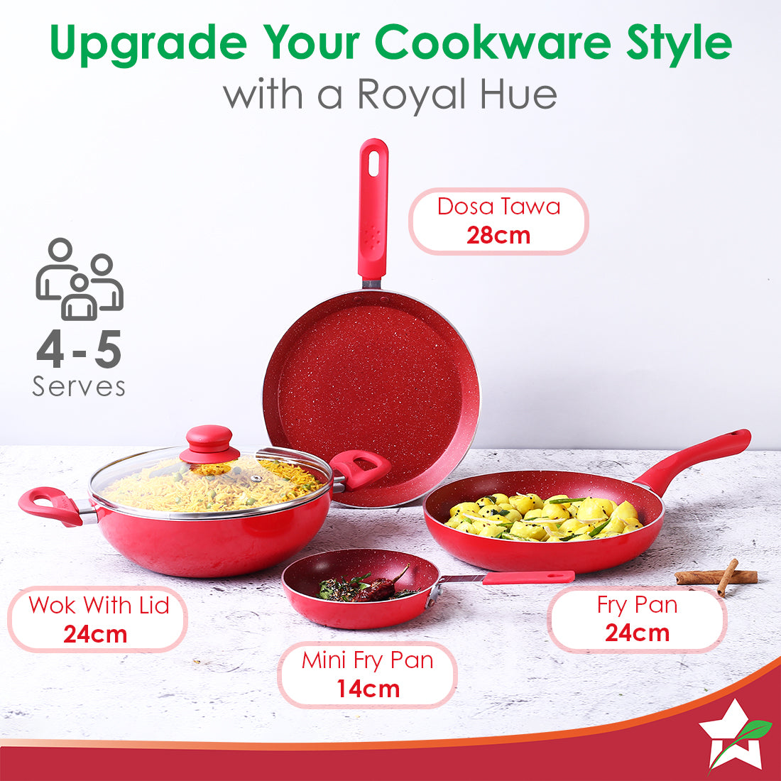 Royal Velvet Non-stick Cookware Set, 5Pc (Fry Pan with Lid, Wok, Dosa Tawa, Mini Fry Pan) Induction bottom, Soft-touch handles, Virgin Grade Aluminium, PFOA/Heavy Metals Free, 3 mm, 2 Years Warranty, Red
