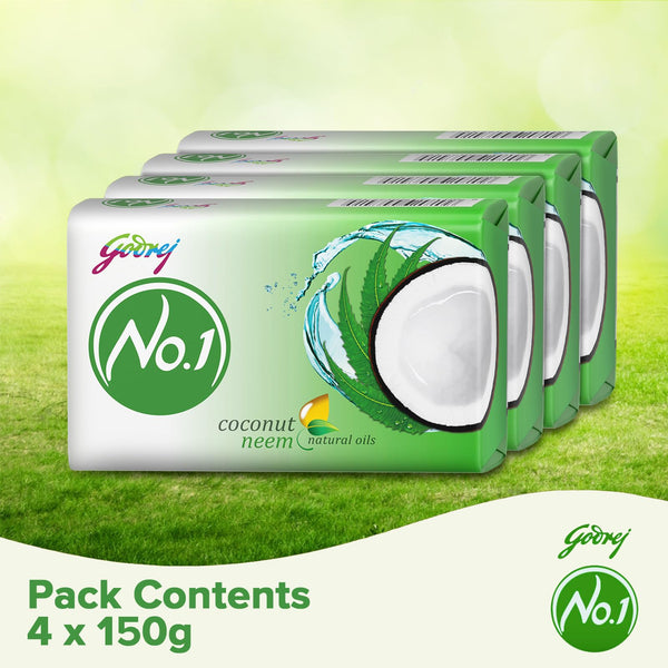 Godrej No.1 Bathing Soap Coconut & Neem Soap Grade 1 Soap & Long-Lasting Fragrance, Combo Pack Of Pack Of 4 (150G Each)