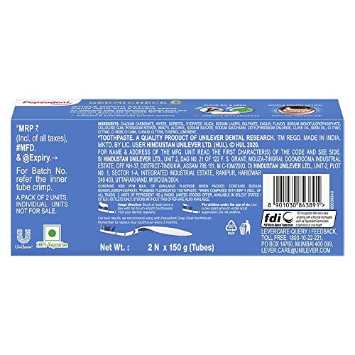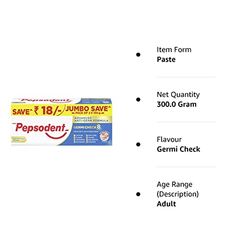 Pepsodent Germicheck 300g (150g x 2, Pack of 2) 8 Actions, Whole Mouth Cavity Protection Plaque Removal Toothpaste With Anti-Germ Formula, Clove And Neem Oil, Jumbo Save Pack