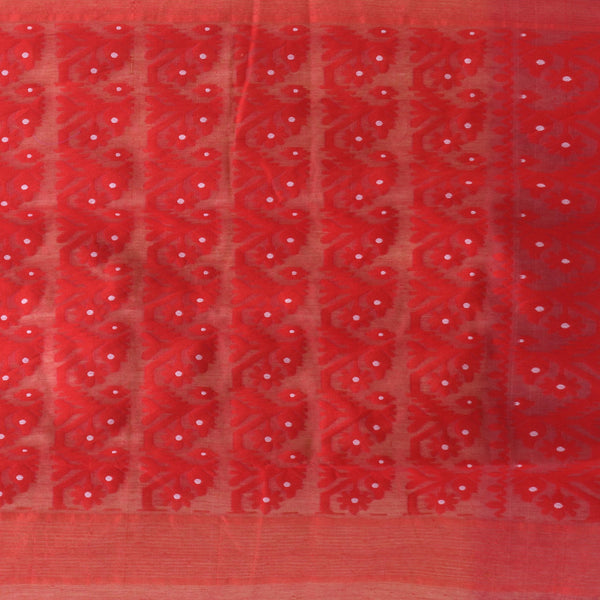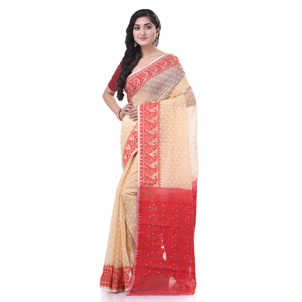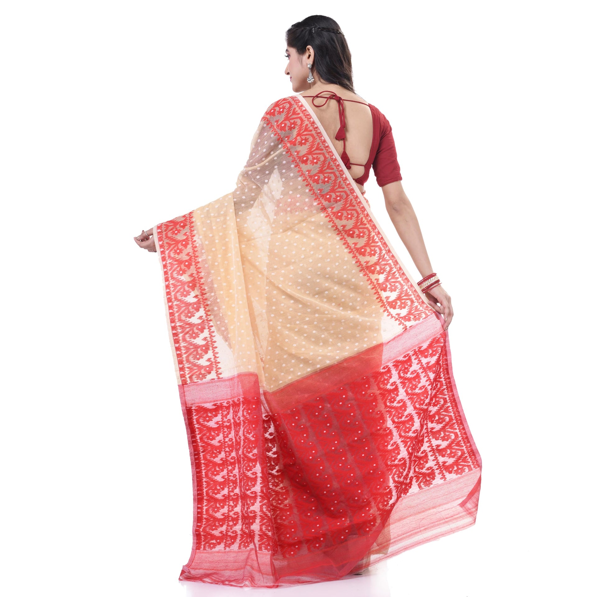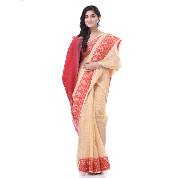 dB DESH BIDESH Women`s Resham Dhakai Jamdani Cotton Handloom Saree Hajar Buti Design Jamdani Saree (Cream Red)
