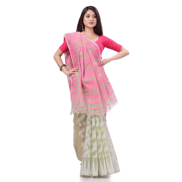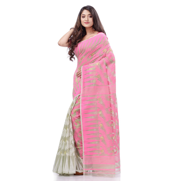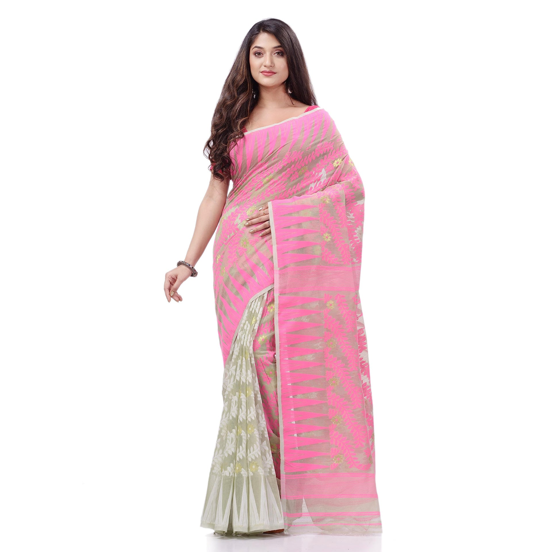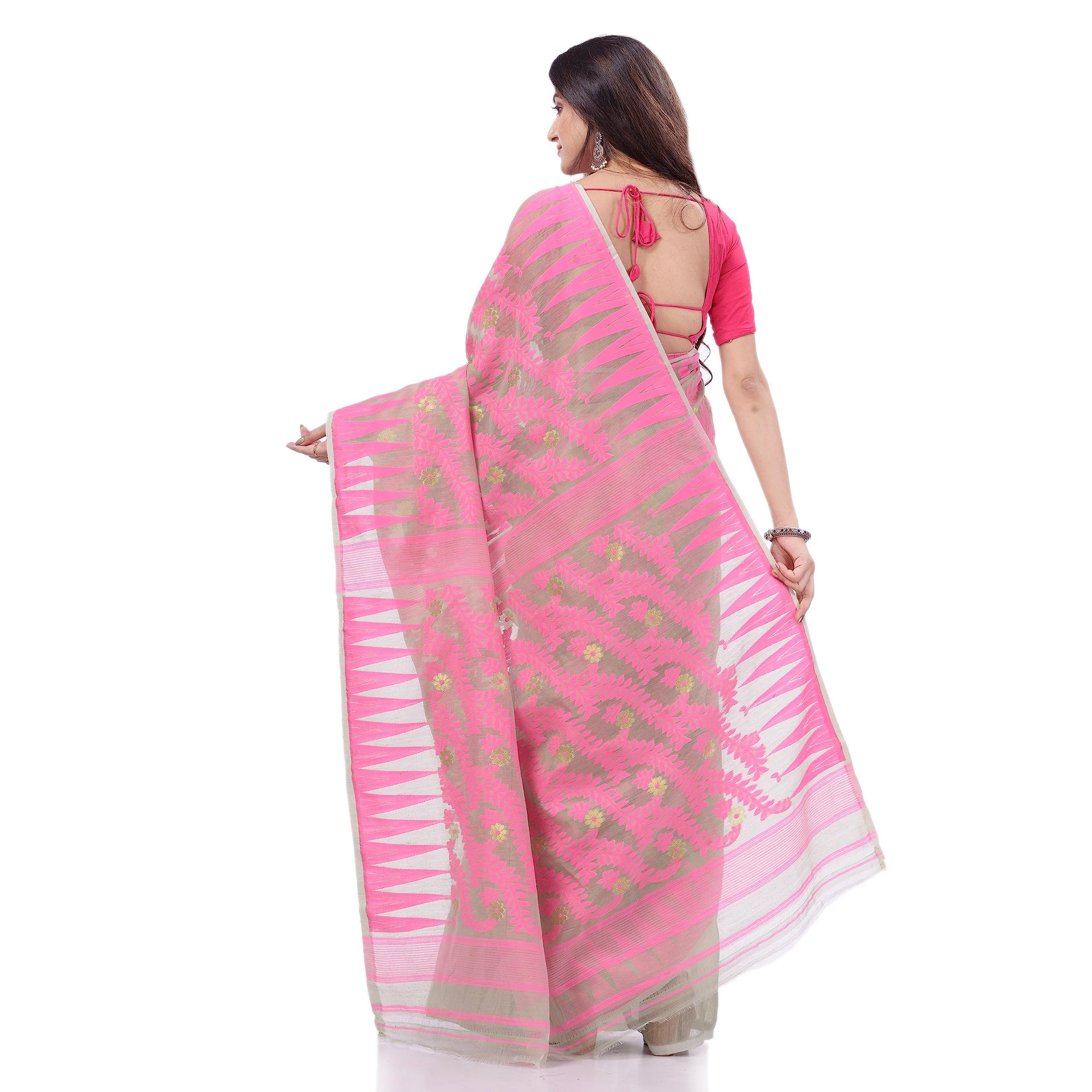 dB DESH BIDESH Women`s Tamarind Leaf Resham Dhakai Jamdani Pure Cotton Handloom Saree Whole Body Design without Blouse Piece (Pink Off White)