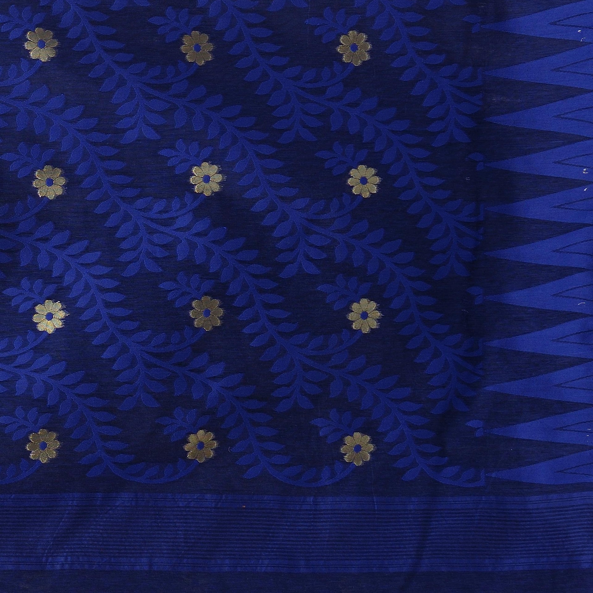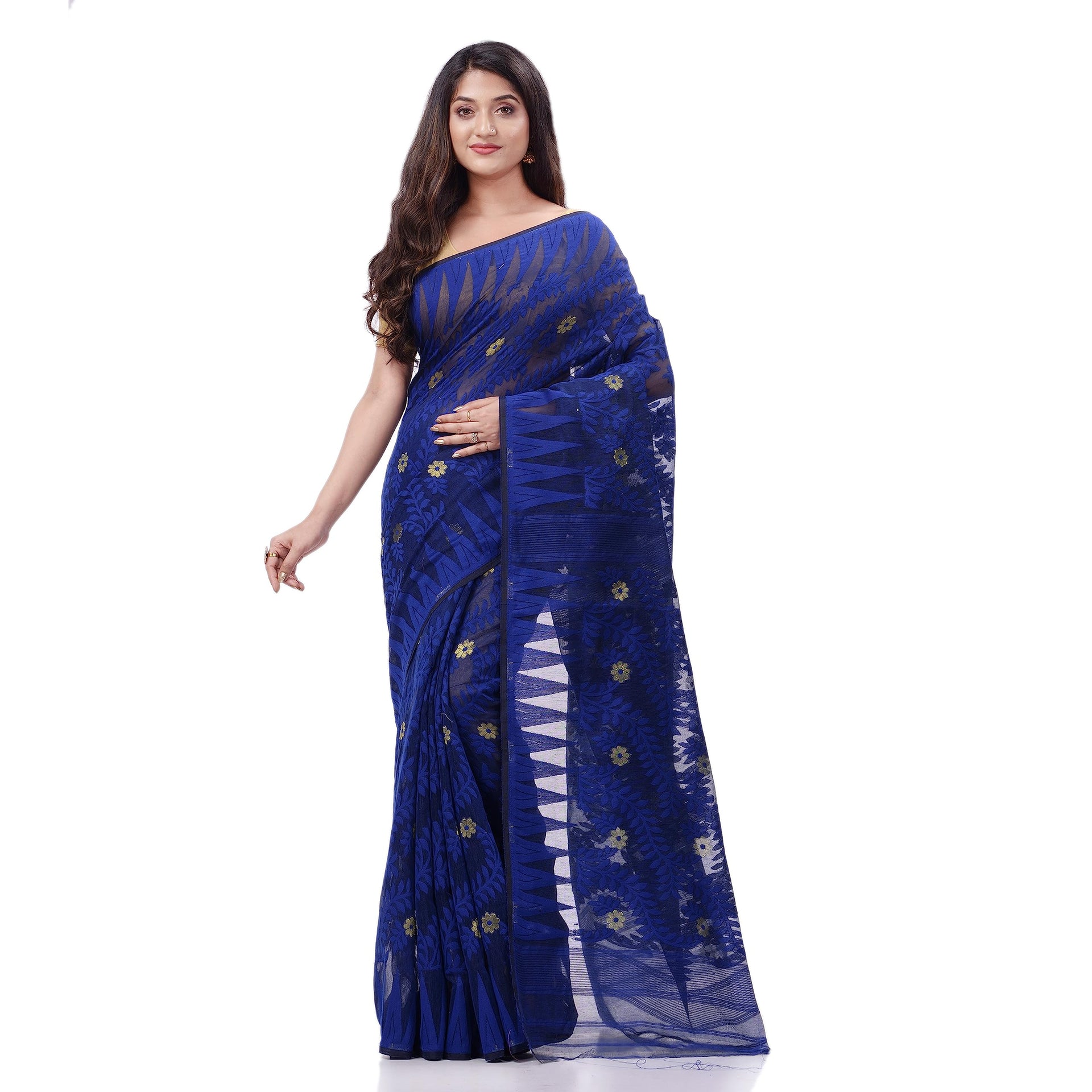 dB DESH BIDESH Women`s Tamarind Leaf Resham Dhakai Jamdani Pure Cotton Handloom Saree without Blouse Piece (Deep Blue)