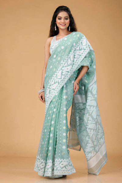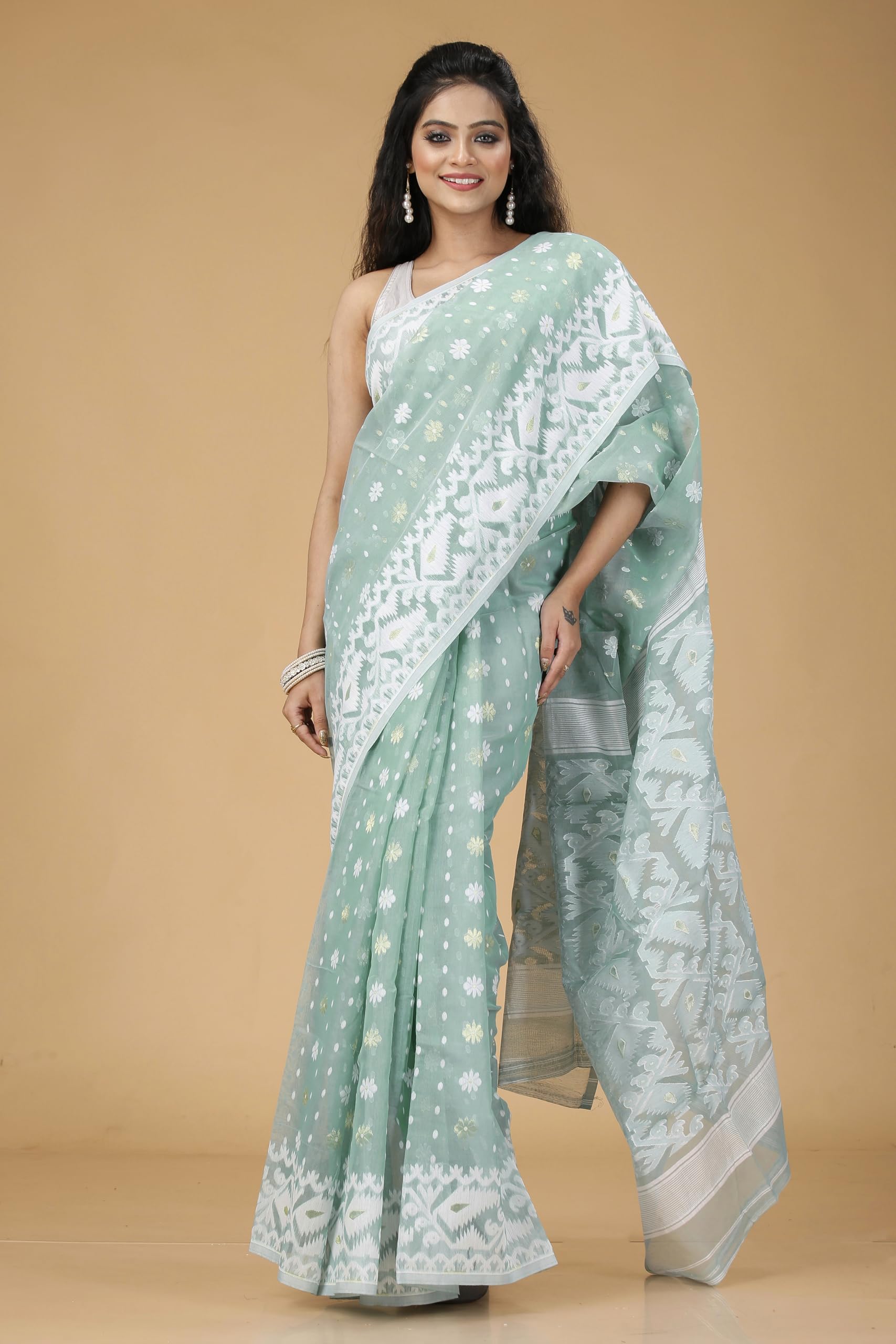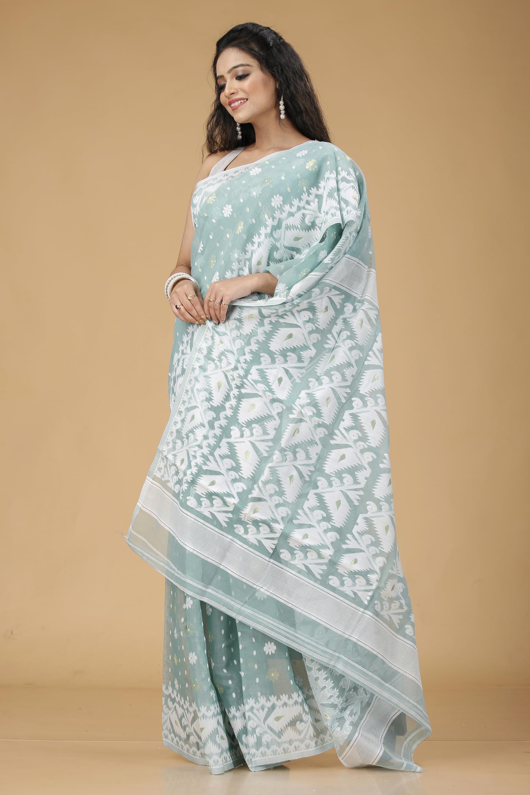 OISHANI SAREE GHOR Women's Traditional Bengal Cotton Silk Soft Jamdani Saree - Beautiful design and Quality - Without Blouse Piece (Pastel Turquoise)