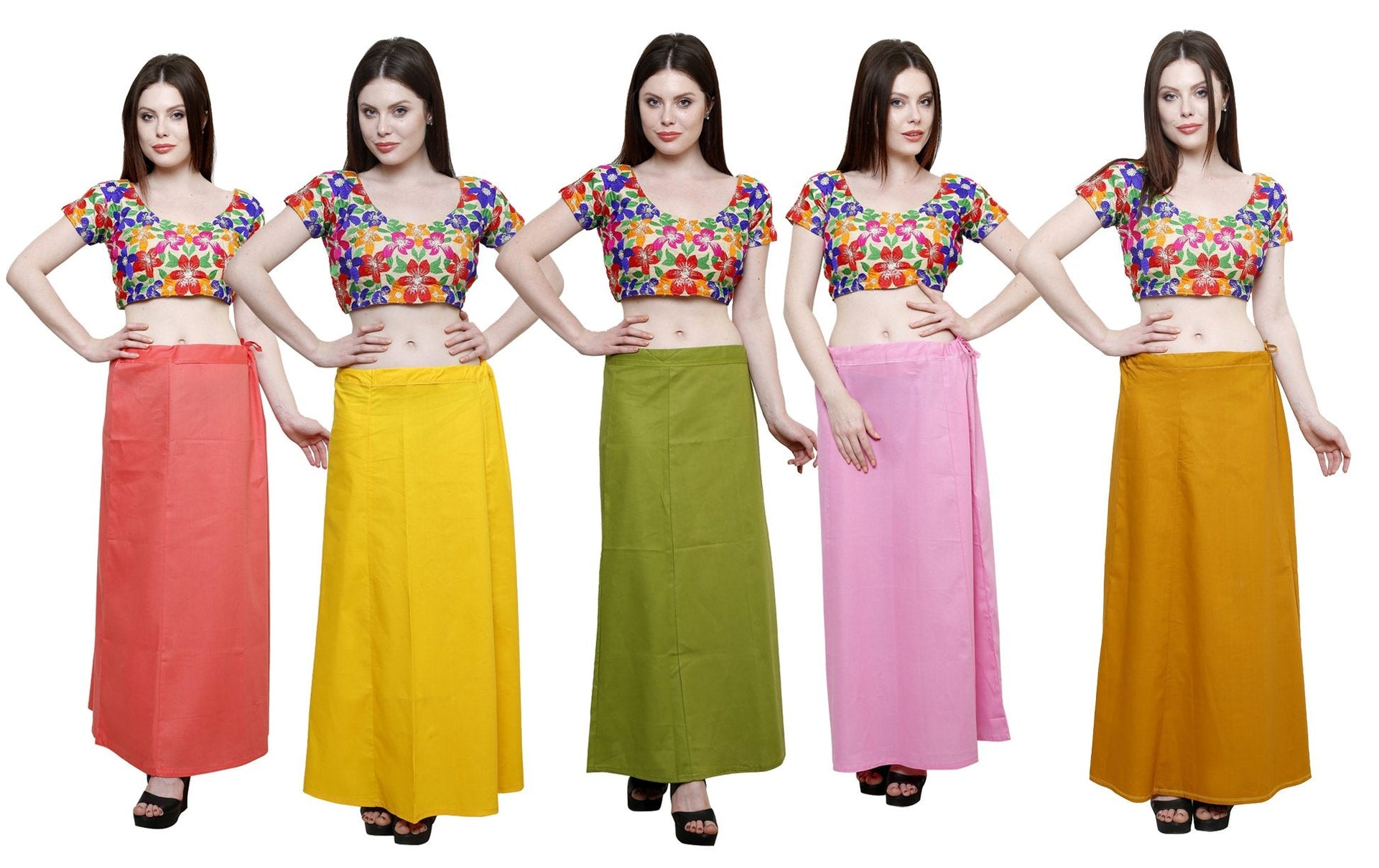 Pistaa's Women's Cotton Saree Petticoat (Peach, Yellow, Mehendi Green, Pastle Pink and Mustard, Free Size) - Pack of 5
