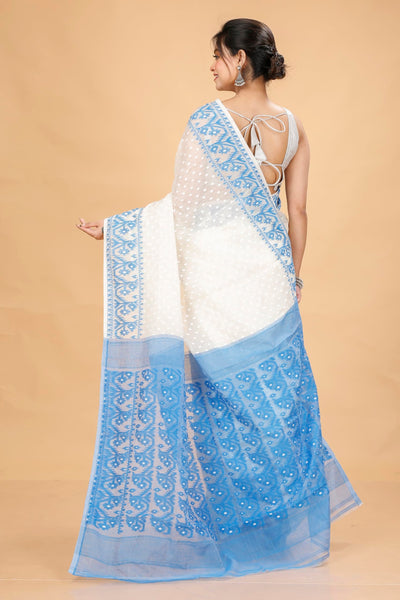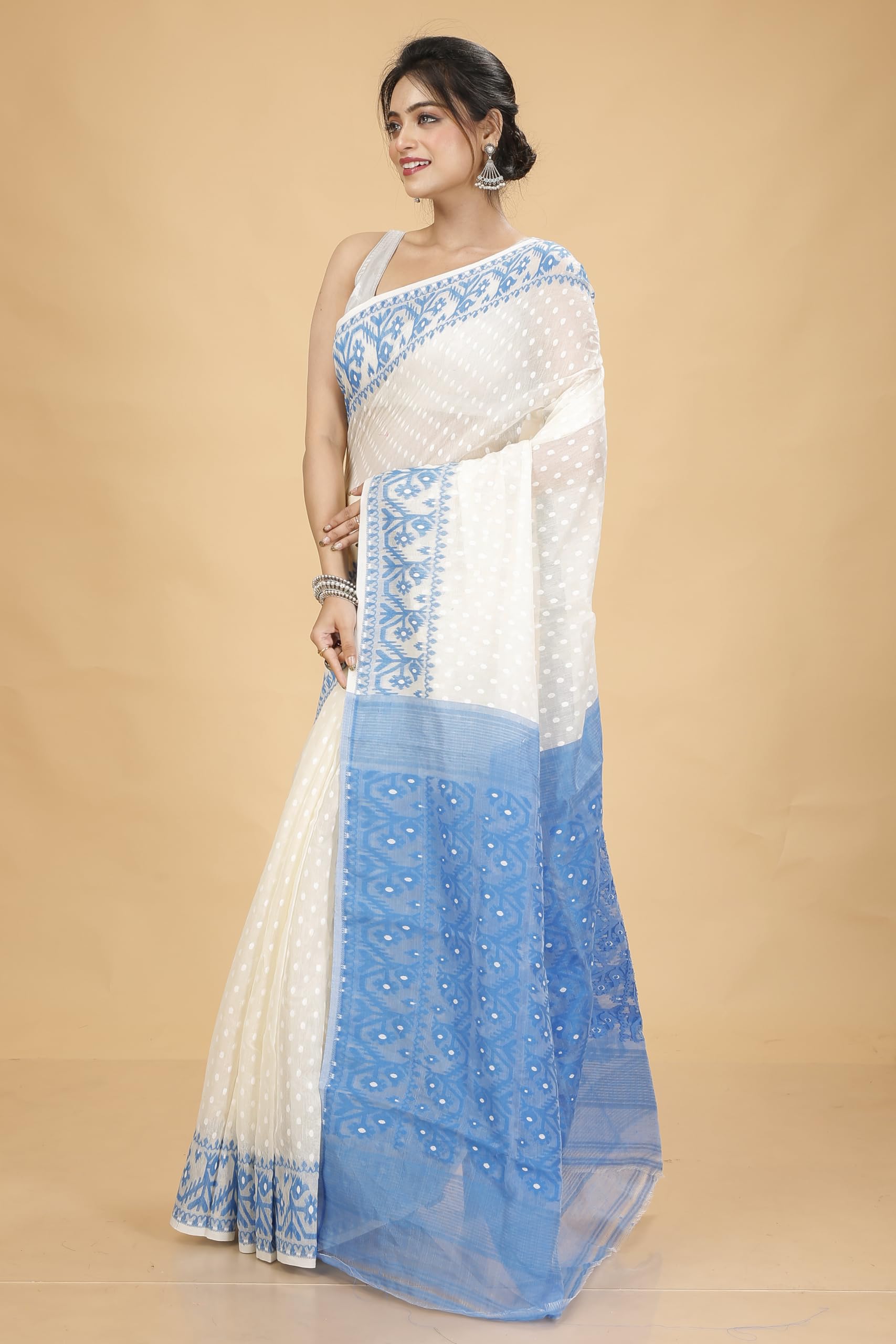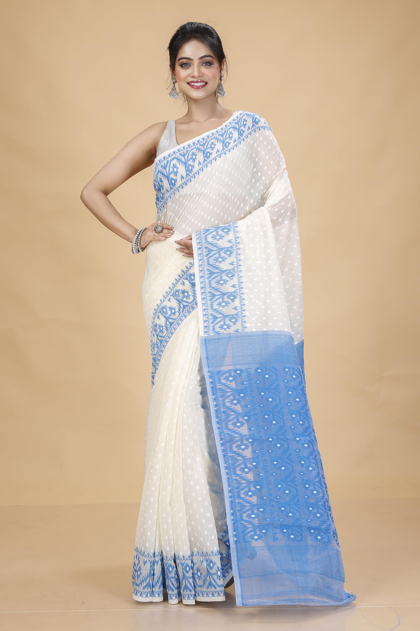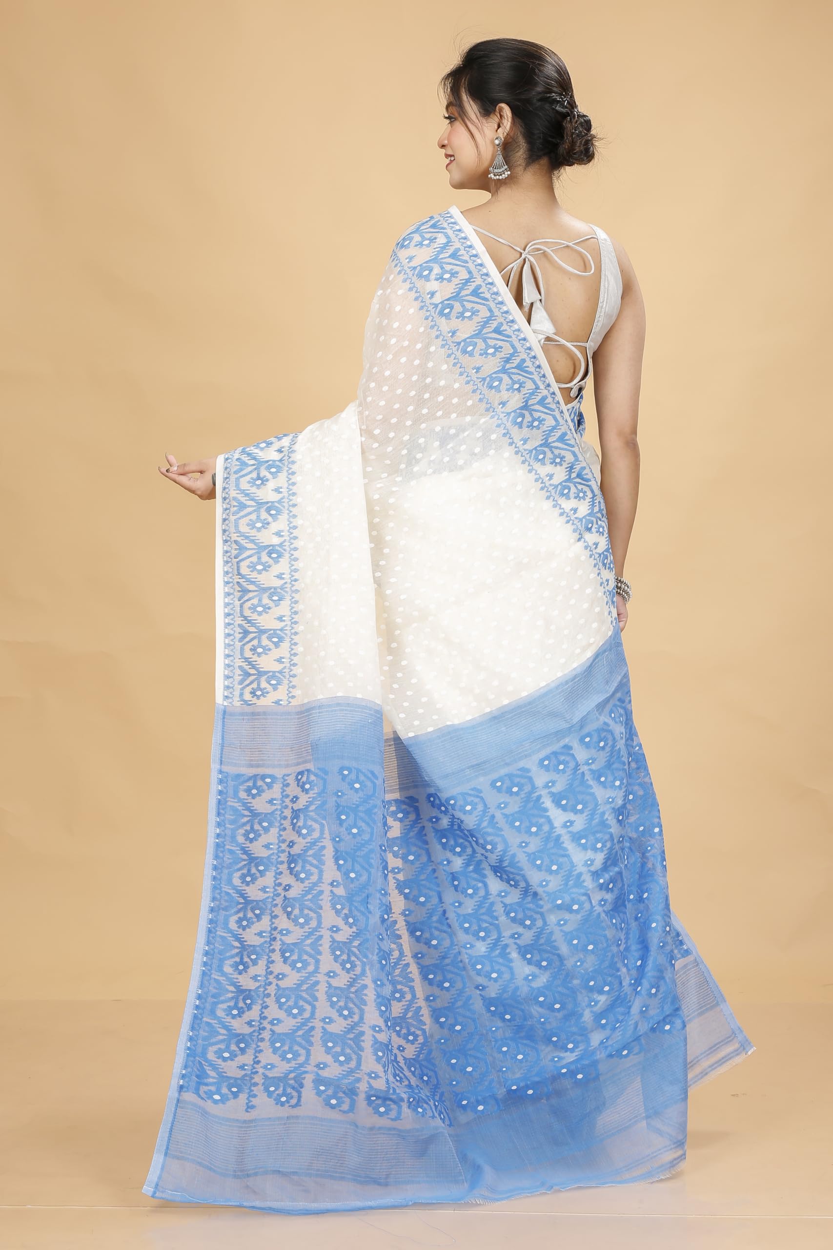 Tant Vastra Women’s Soft Resham Dhakai Ball Work Jamdani Saree without Starch And Without Blouse Piece (Steel) (White-Light Blue)