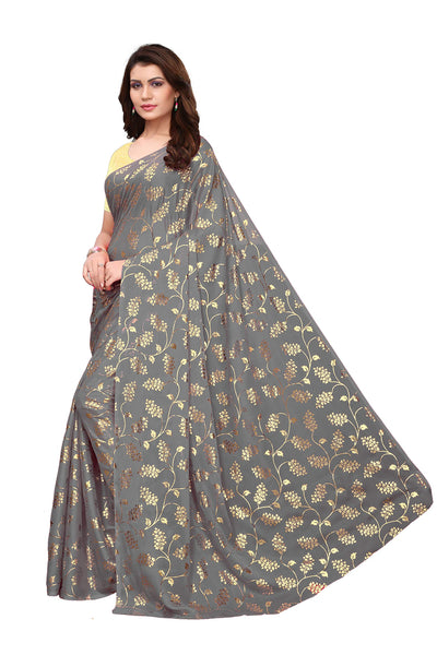 Yashika Silk with Blouse Piece Saree (FOIL Floral Black_Grey_Free Size)