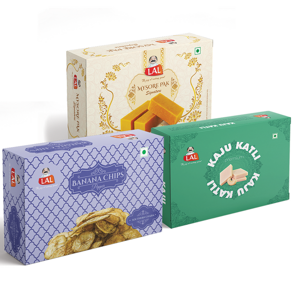 Mysore pak signature 400g, Banana chips pepper 250g and Kaju katli 400g