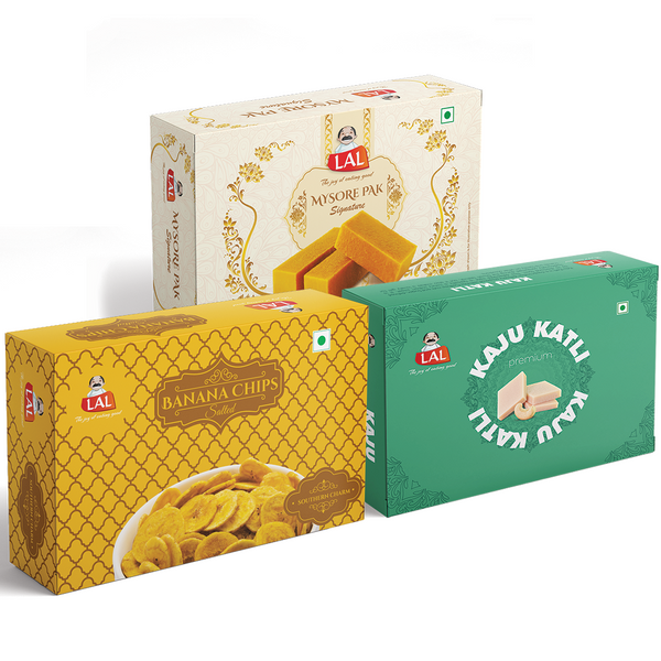 Mysore pak signature 400g, Banana chips salted 250g and Kaju katli 400g