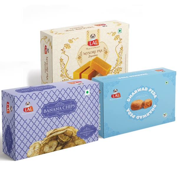 Mysore pak signature 400g, Dharwad peda 400g, Banana chips pepper 250g