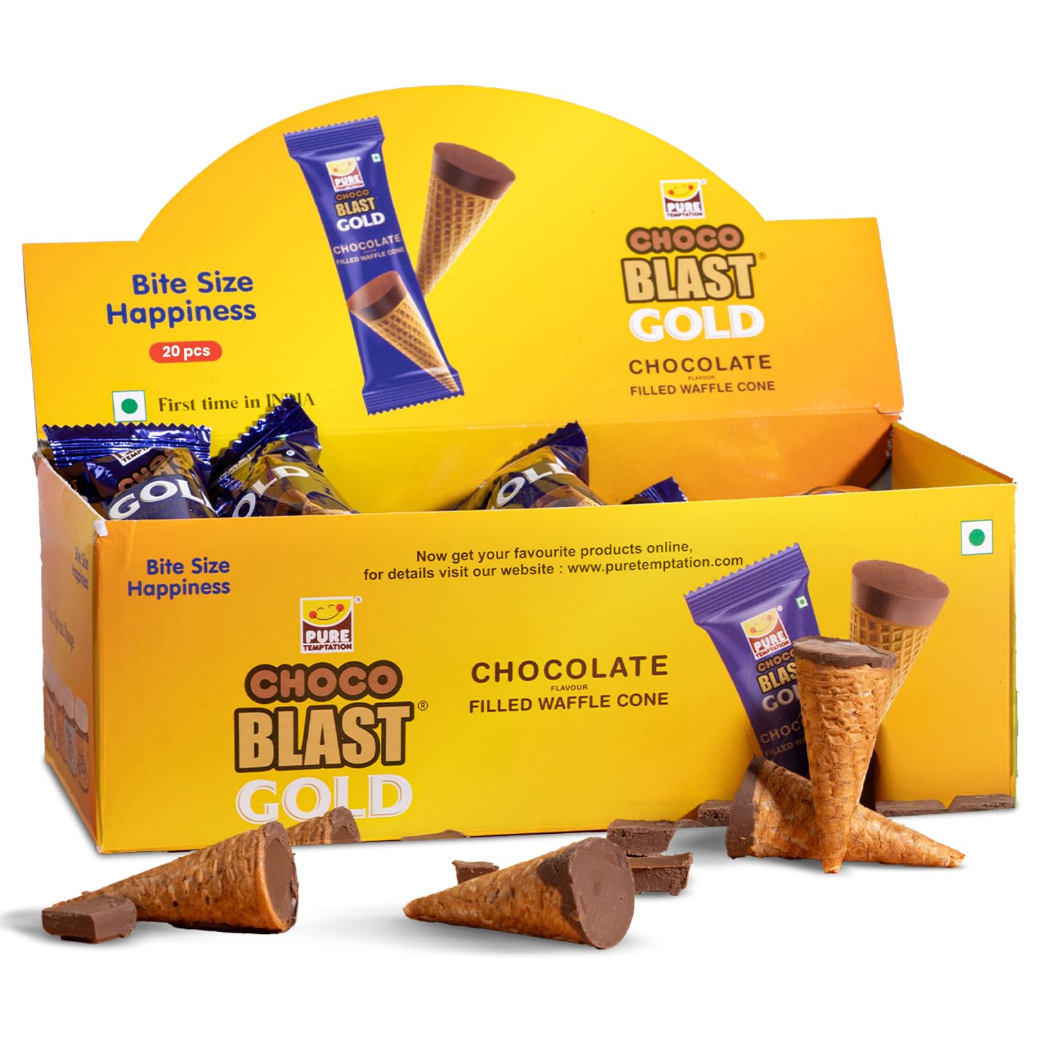 Pure Temptation Chocoblast Chocolate-Filled Waffle Cones [20 Pieces Box] Snacks for Kids & Adults - Non-Meltable Chocolate, Valentine Gift Box - Individually Wrapped Chocolate Cone Bites, 375 Gram