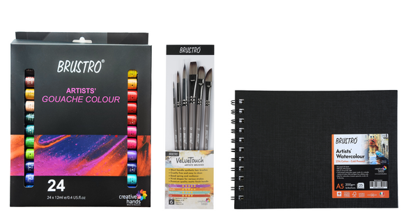 BRUSTRO Artists Gouache Colour Set of 24 Colours X 12ML Tubes with 25% Cotton Watercolour Wiro Journal Cold Pressed 200 GSM A5-25 Sheets and VelveTouch Artist Brushes set of 6