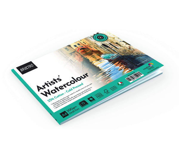 BRUSTRO Artists Natural Hair MOP Brush Set of 4 (0, 2, 4, 8) with Artist Watercolour Pad Cold Pressed 300 GSM 25% Cotton A4 - (12 + 4 Free Sheets)